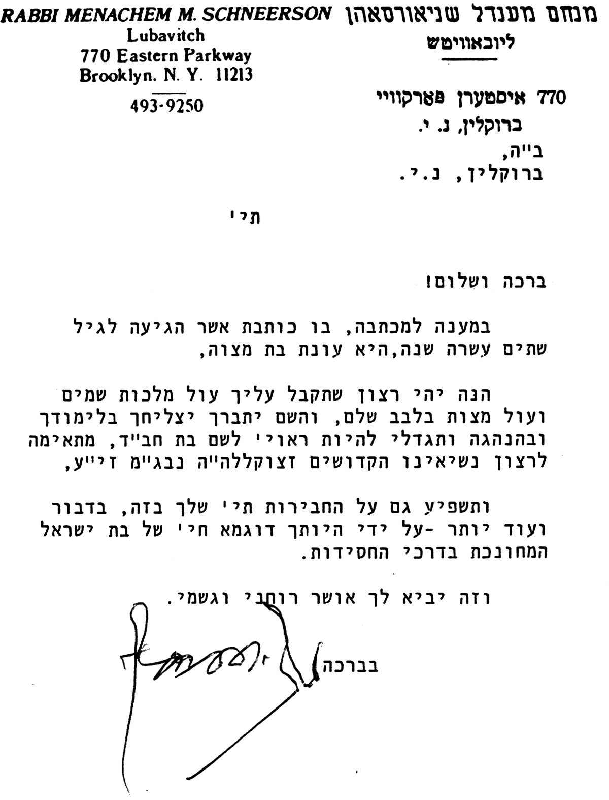 Lettre du Rabbi à l'occasion de la Bat Mitsvah